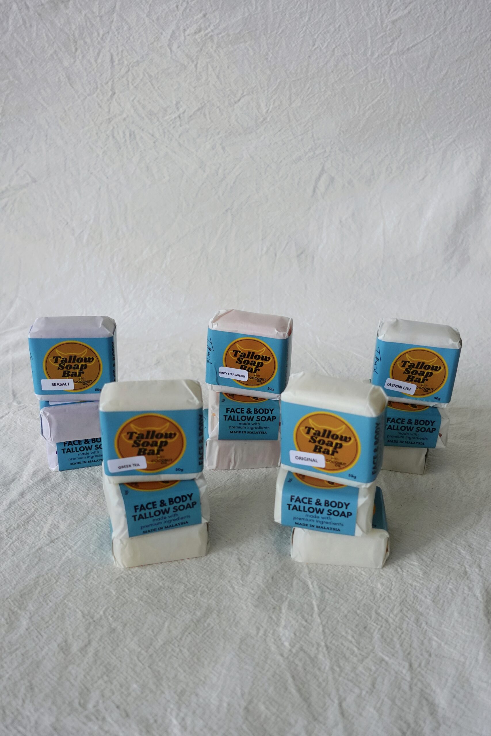 - Ingredients: Pure tallow, coconut oil, palm oil, lye water, sea salt, fragrance oil, soap coloring.